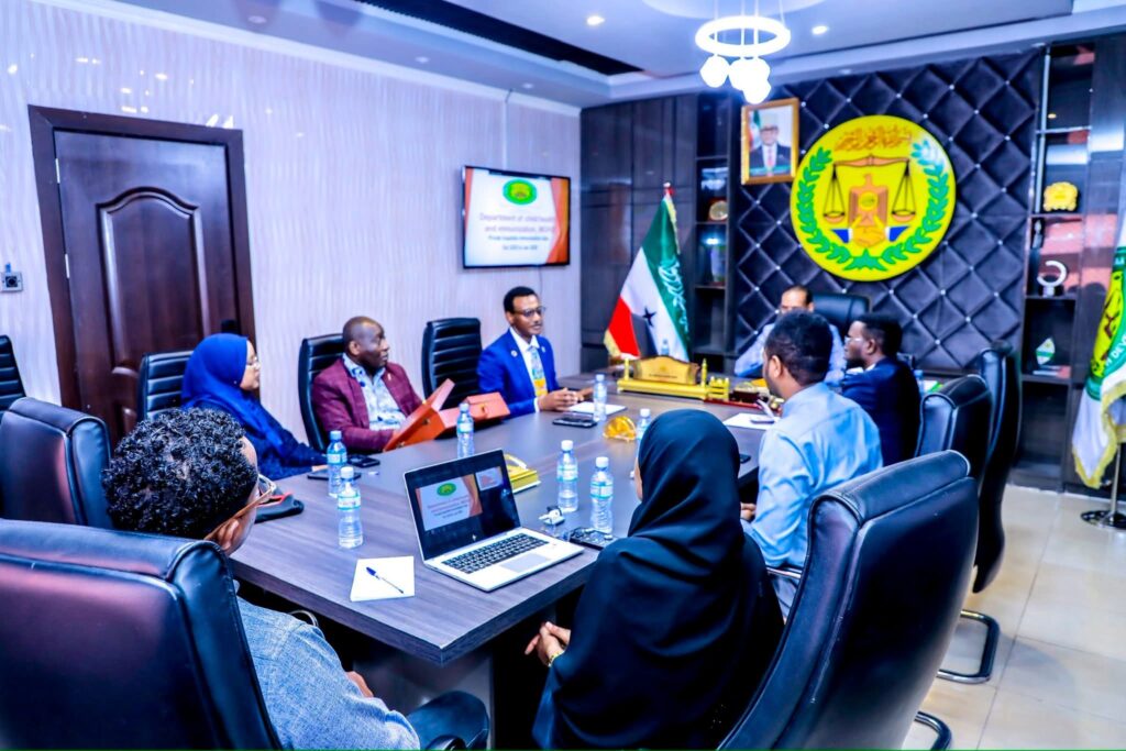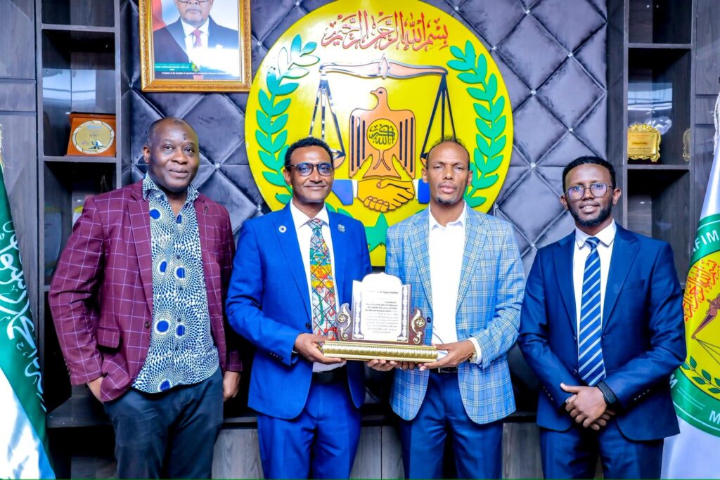 The Minister of Health Development, Dr. Hussein Bashir Hirsi, and the Director General of the Ministry, Dr. Ahmed Mahmoud Jama, today received a certificate of honor from UNICEF, which was presented to the Ministry, especially the Department of Vaccination and Child Health, in recognition of its continuous efforts to improve children’s health.